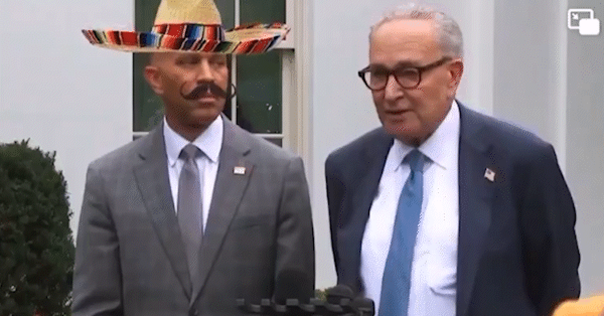 Jeffries is wearing a fake sombrero and moustache while Schumer is speaking in a fake voice disparaging Democrats.