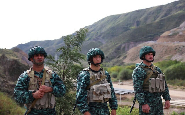 Azerbaijan soldiers stand guard at the Lachin checkpoint, on September 26, 2023. (Emmanuel Dunand / AFP)